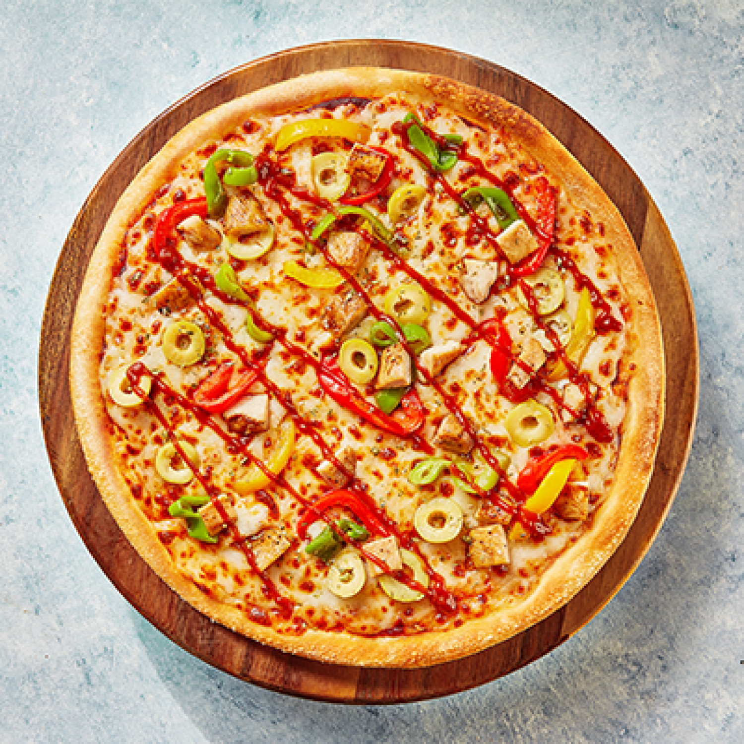 دجاج متبل ، بيف ، بيبروني ، مشروم ، موتزاريلا ، جبنة شيدر ، جبنة كيري ، جبنة رومي ، فلفل الوان ، زيتون ، رانش صوص ، صوص طماطم