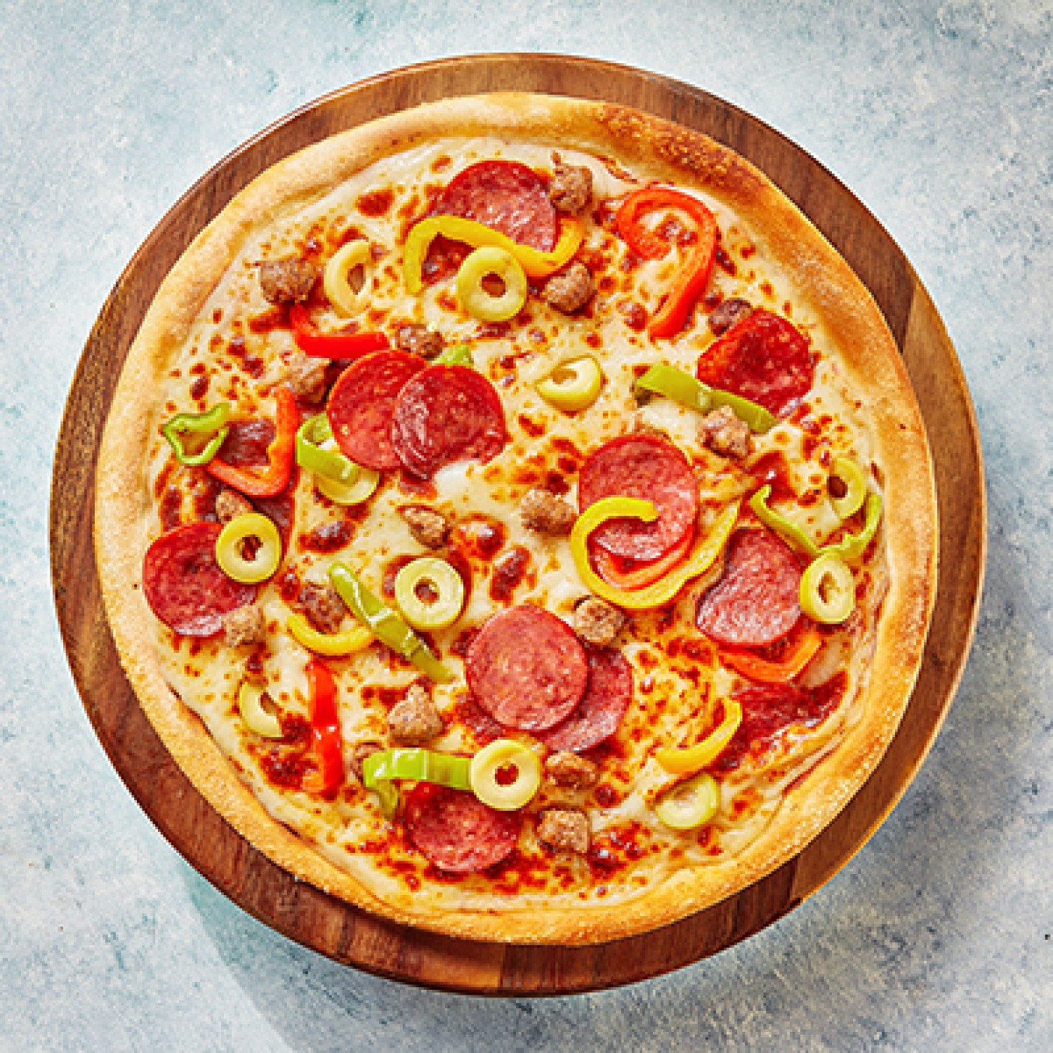 دجاج متبل ، بيف ، بيبروني ، مشروم ، موتزاريلا ، جبنة شيدر ، جبنة كيري ، جبنة رومي ، فلفل الوان ، زيتون ، رانش صوص ، صوص طماطم