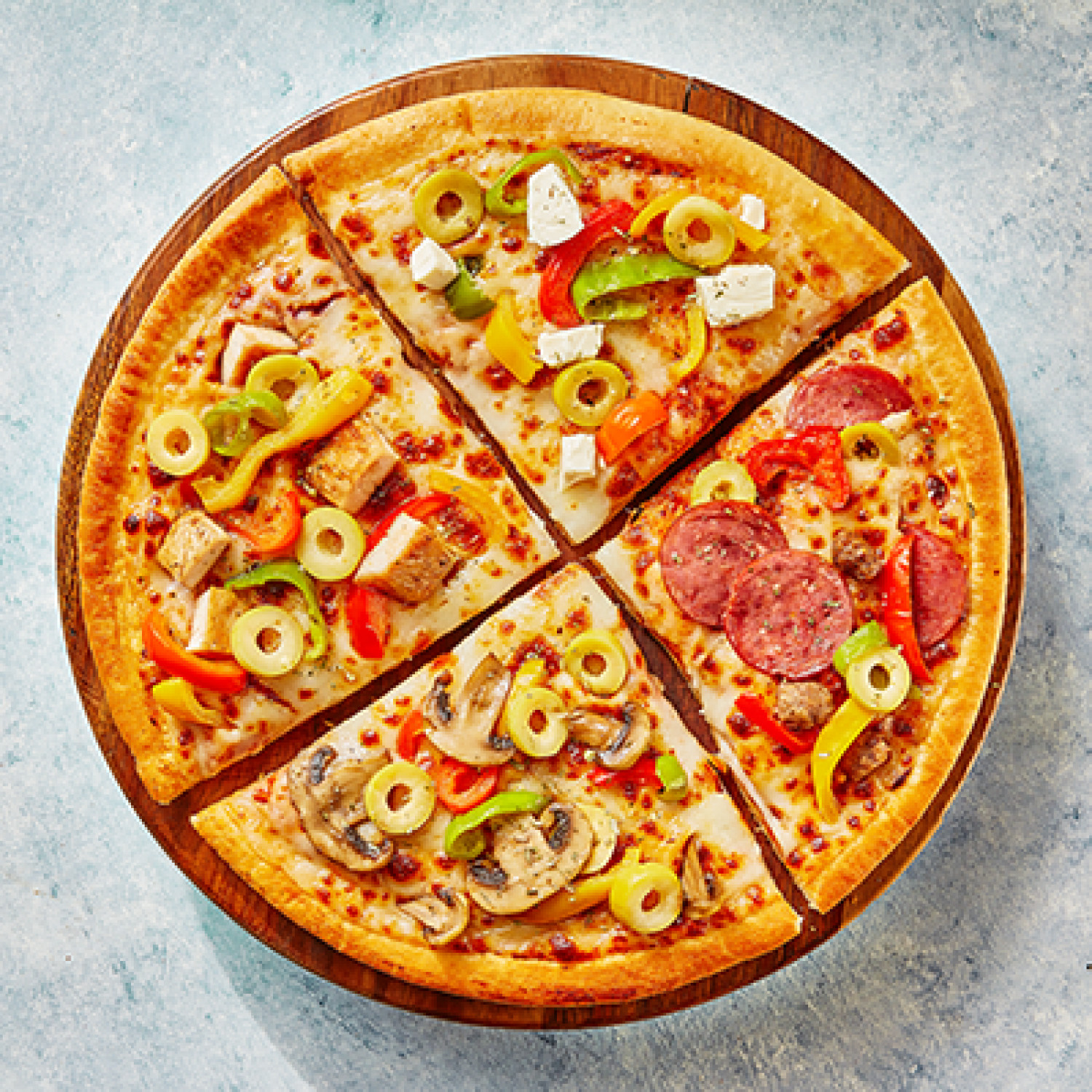 دجاج متبل ، بيف ، بيبروني ، مشروم ، موتزاريلا ، جبنة شيدر ، جبنة كيري ، جبنة رومي ، فلفل الوان ، زيتون ، رانش صوص ، صوص طماطم